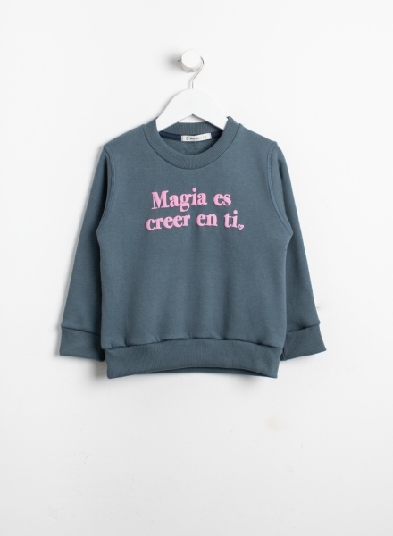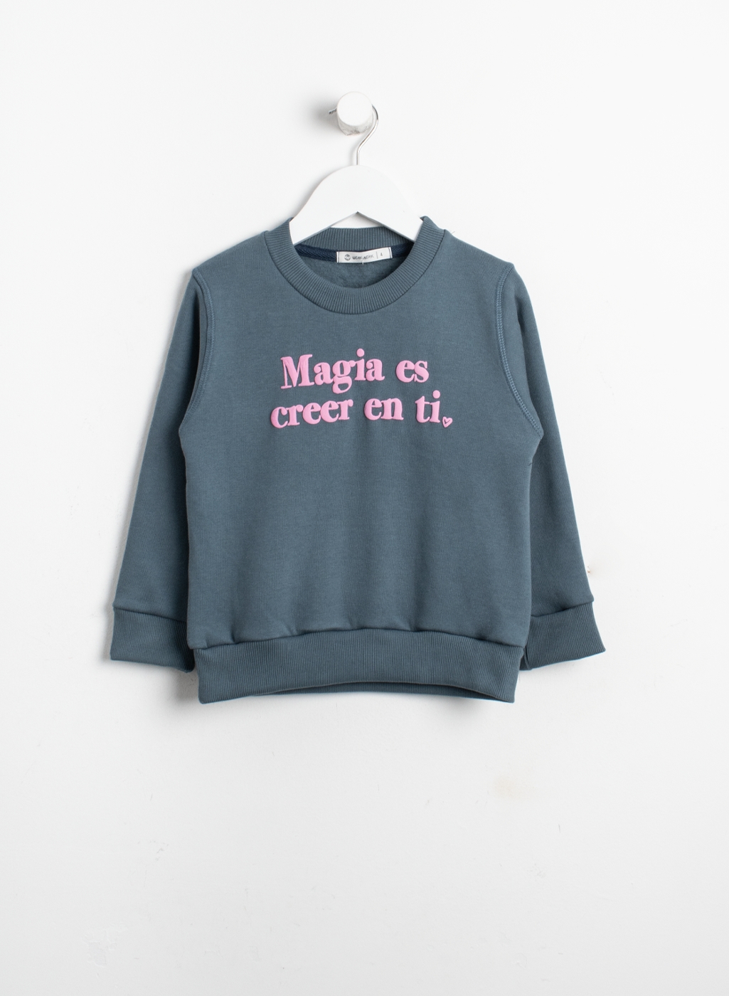 Buzo cuello redondo de frisa con estampa central. Terminación con puños de morley