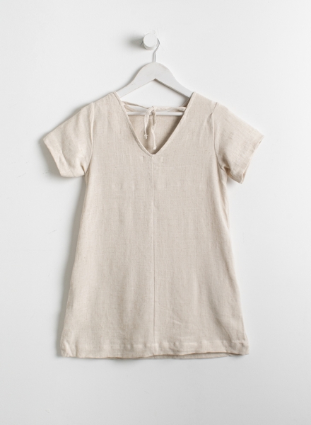 Vestido manga corta, escote en V con recortes. Lavar a mano.