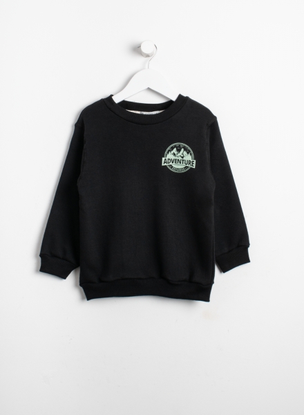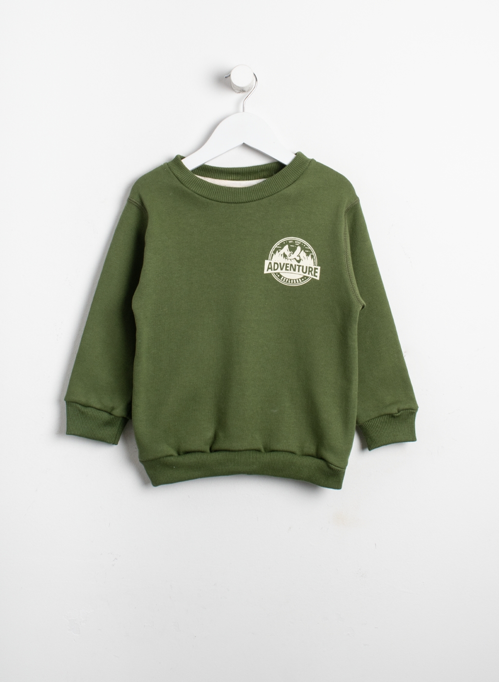 Buzo corte básico de frisa con cuello redondo y pequeña estampa. Desde talle 4