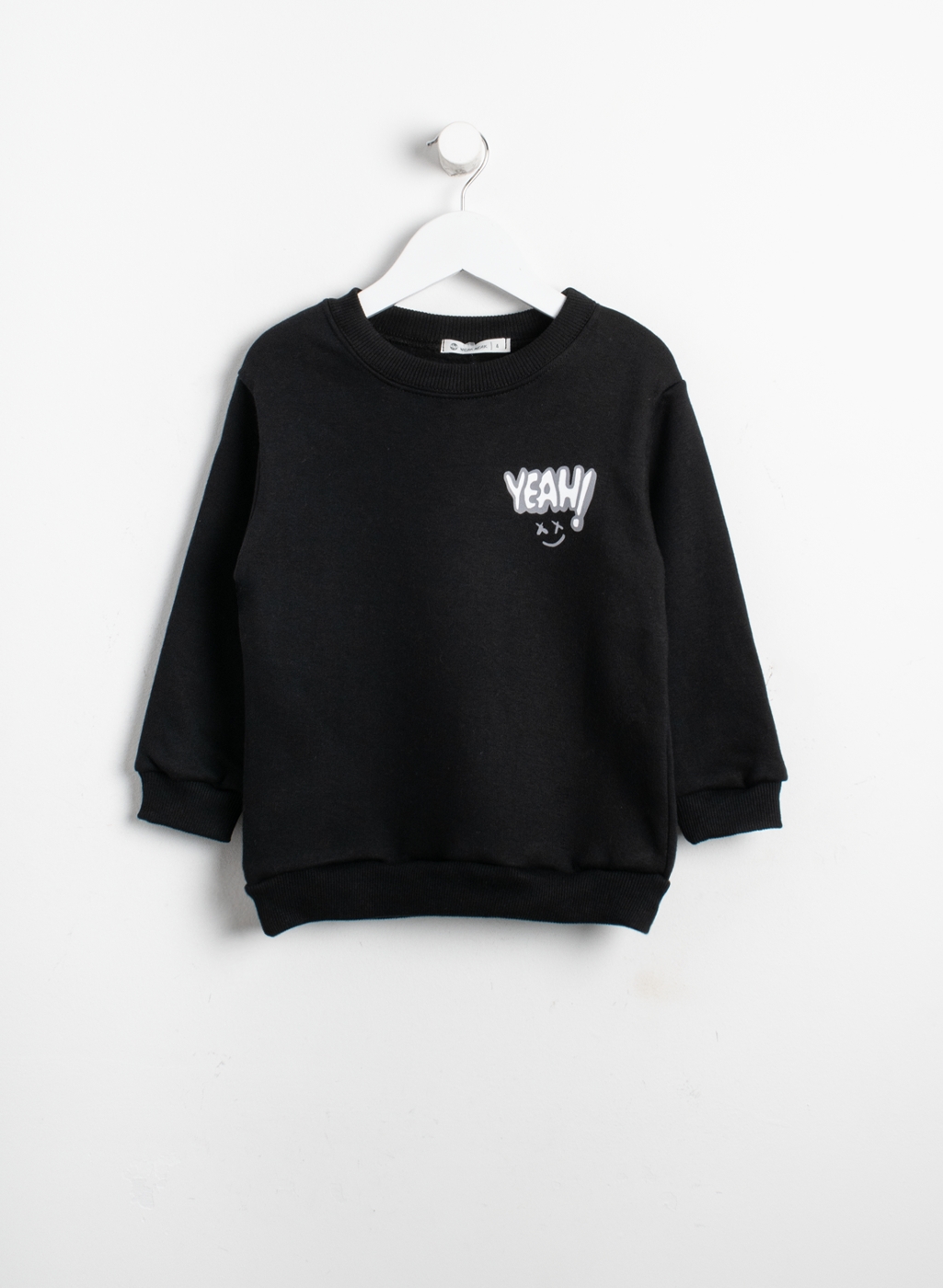 Buzo corte básico de frisa con cuello rendo y pequeña estampa. Desde talle 4