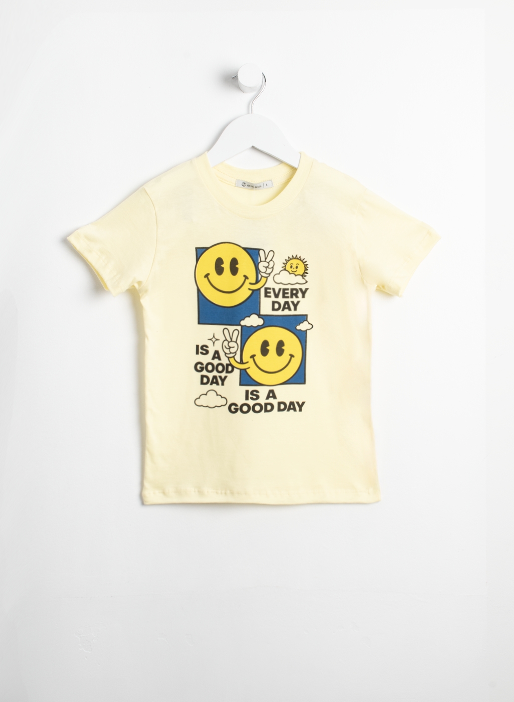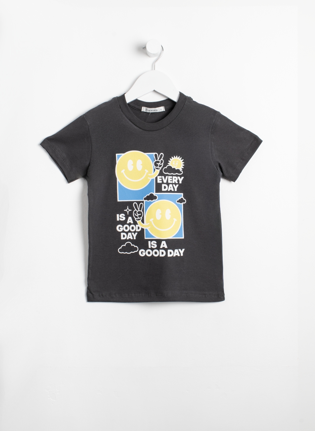 Remera manga corta de jersey, con estampa en la parte frontal. Con cuello de ribb.