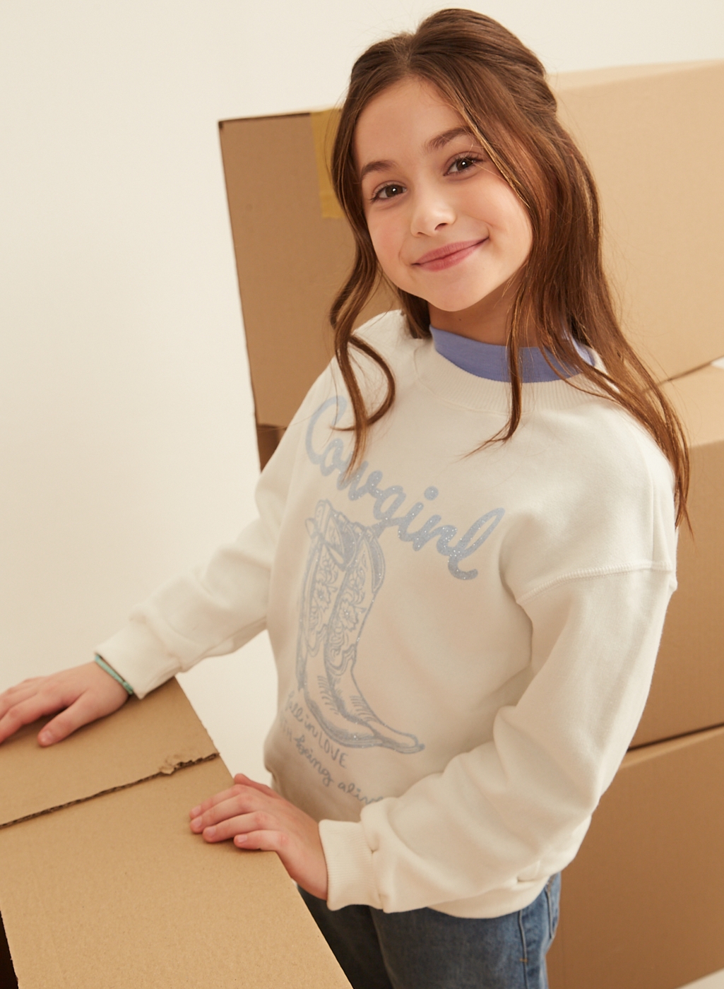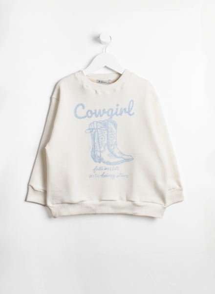 Buzo oversize de frisa cuello redondo. Posee estampa central con glitter y puños de morley.