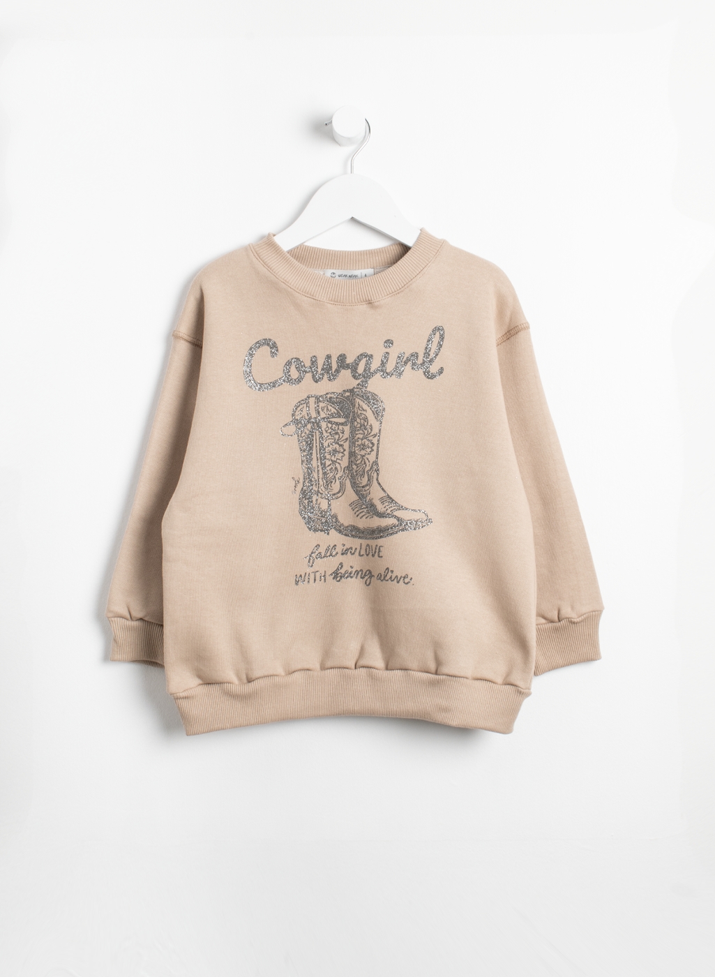 Buzo oversize de frisa cuello redondo. Posee estampa central con glitter