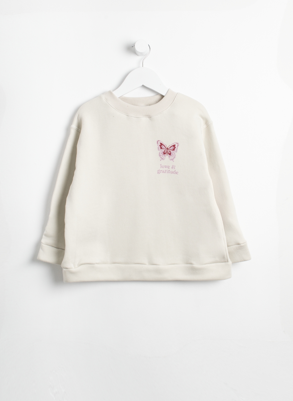 Buzo de frisa cuello redondo oversize con puños de morley y pequeña estampa con glitter.