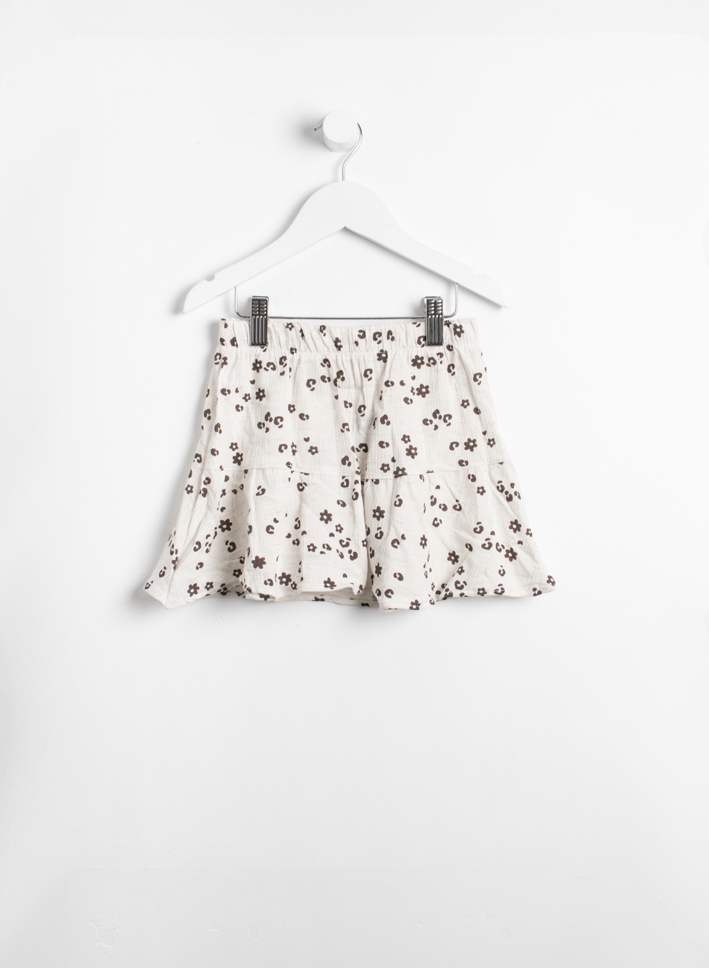 Falda con elástico en la cintura rebatida y volado, tela estampada.