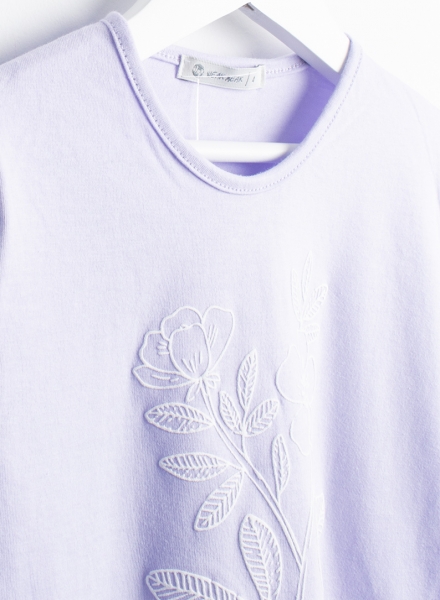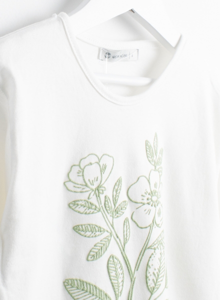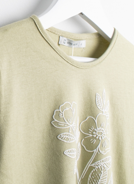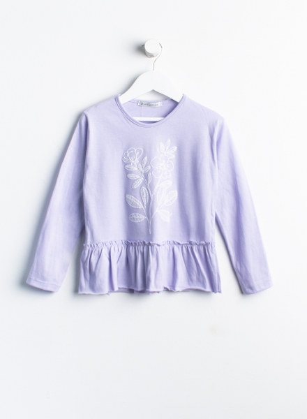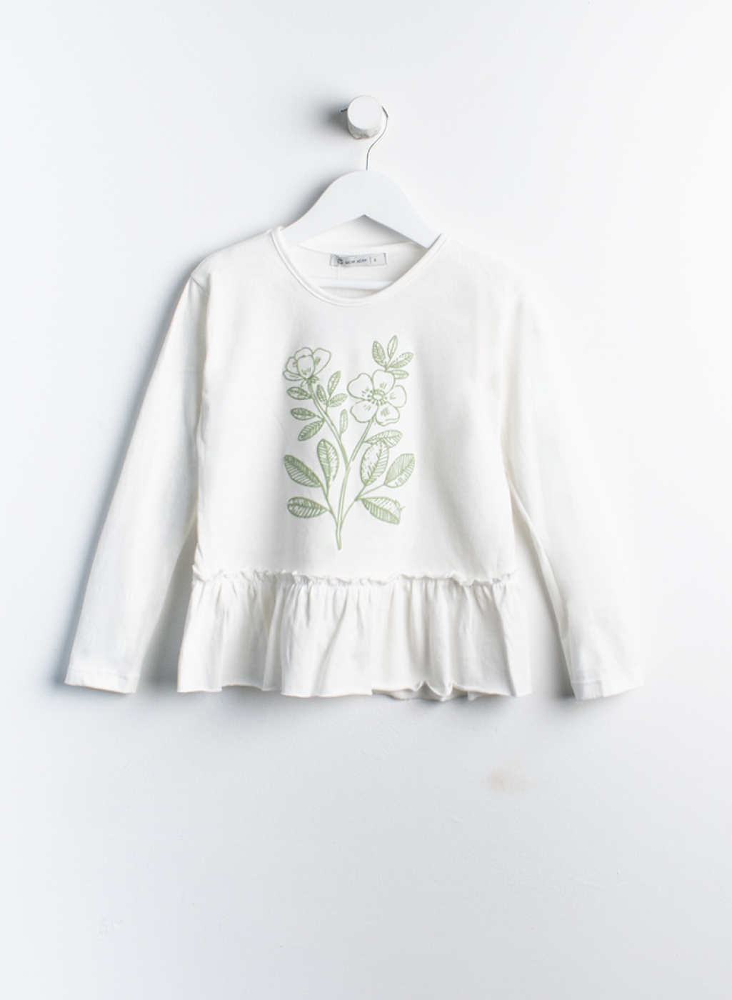 Remera con estampa frontal de flores.Y volado en la cintura.
