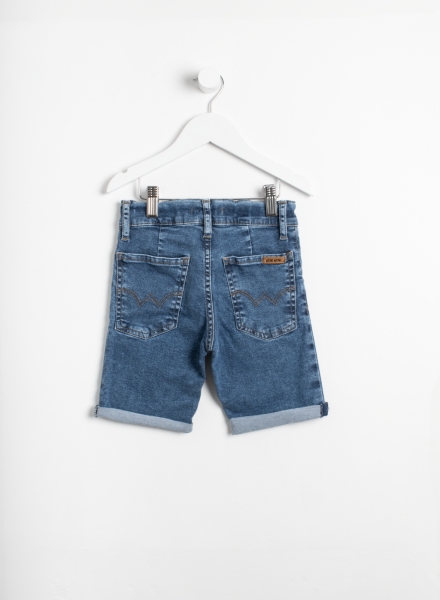Bermuda de denim con bolsillos en ruedo. Con elástico regulable en la cintura.