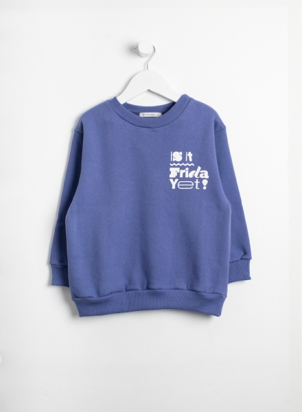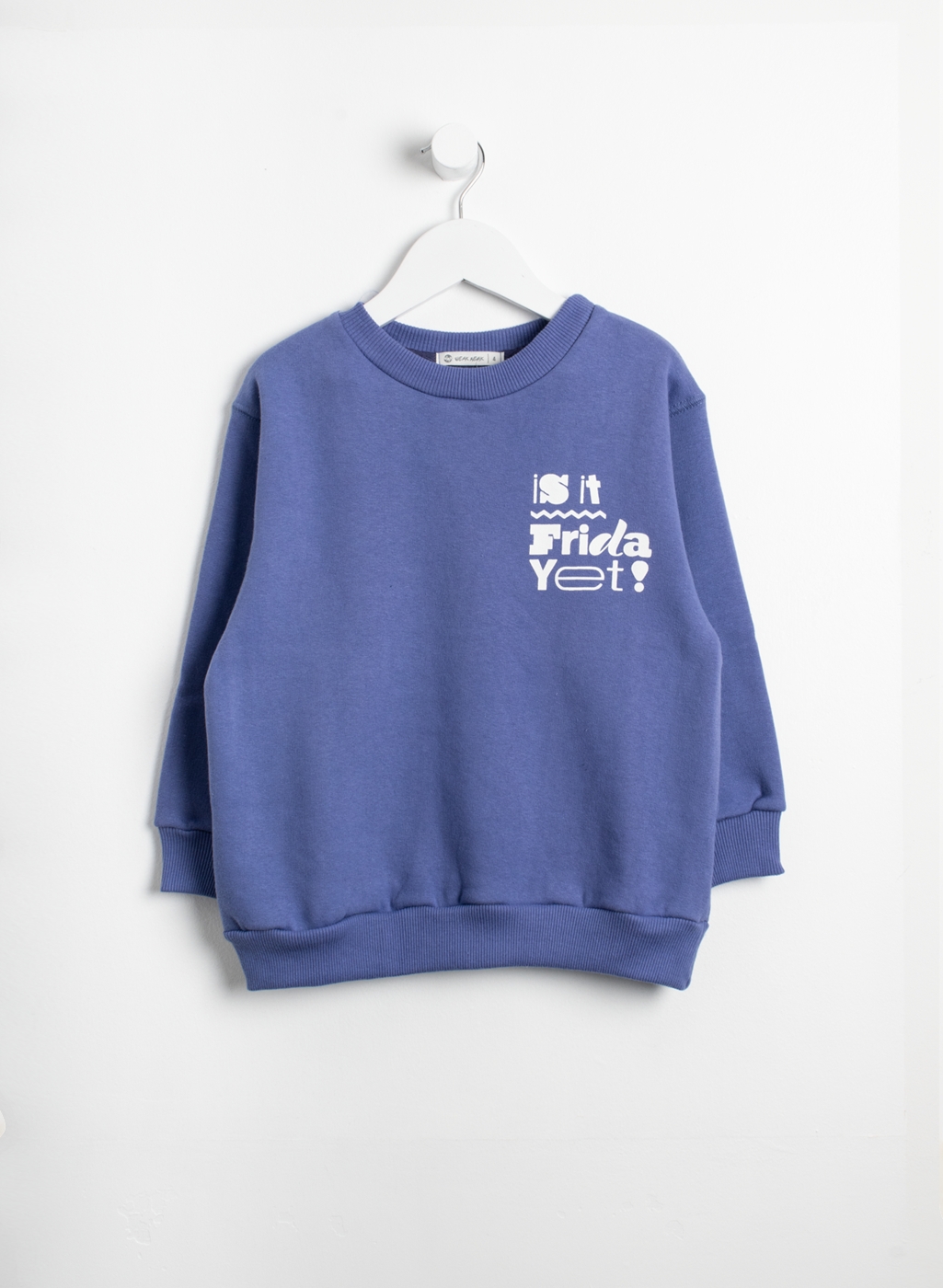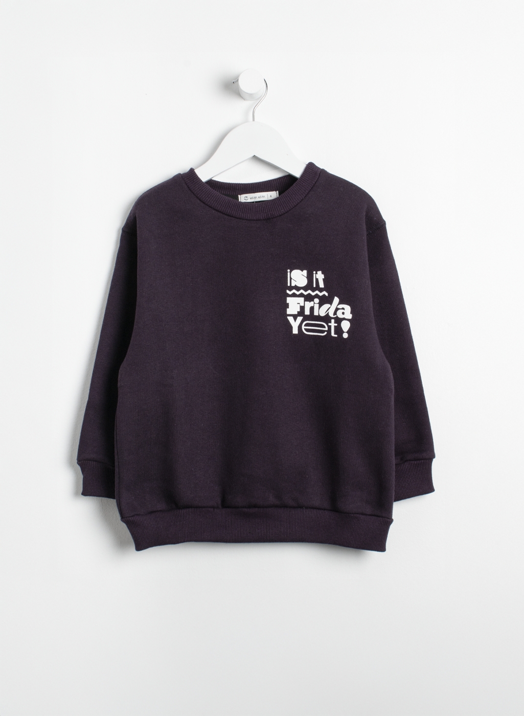 Buzo de frisa oversize, cuello redondo con pequeña estampa. * Color petróleo corresponde a color azul violáceo. * Color bordo corresponde a violeta oscuro.